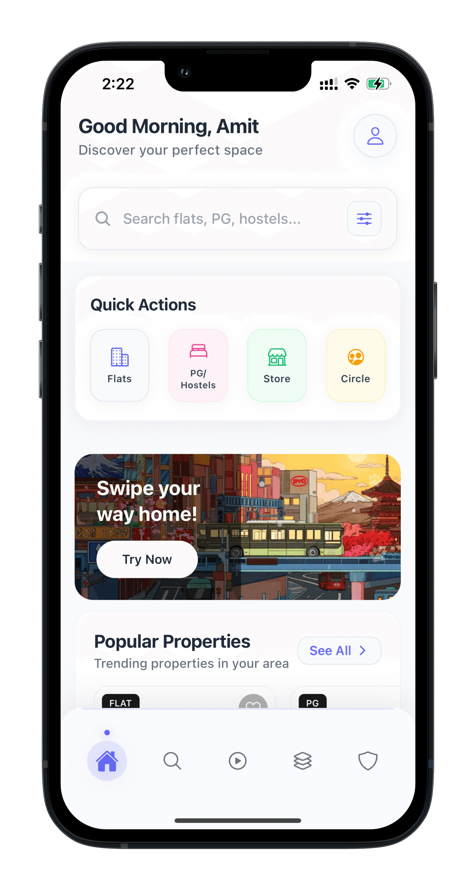 Find PGs, hostels & flats by scrolling — real rooms, real vibes, real availability.